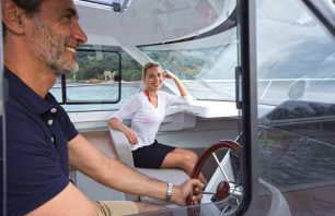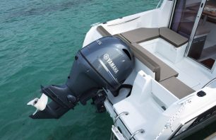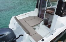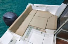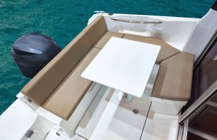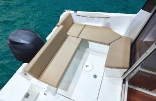 Кокпит: Сдвижное заднее сиденье выполняет свои функции и при поднятом двигателе. U-образный салон кокпита (опция) со столом, можно трансформировать в лежак для загара. Верхний тент от солнца на кокпит (опция) и съемные боковые и задние тенты (опция) дают возможность находится на кокпите в любую погоду. Раскладной кормовой трап для спуска/подъема на воду. 220V разъем берегового питания + зарядное устройство (опция), позволяет пользоваться на берегу абсолютно любыми бытовыми электроприборами.
