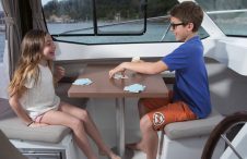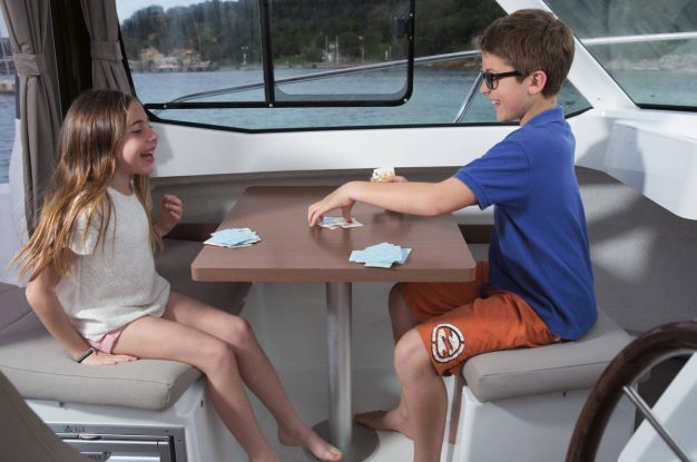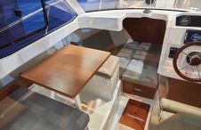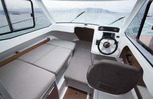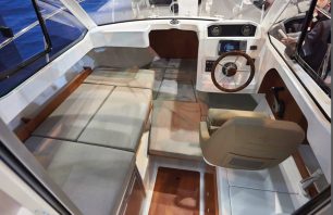Салон, каюта: Просторный салон для своего класса. Удобная обеденная зона со столом, трансформируется в полноценное спальное место, или вперед-смотрящее сидение (опция). Холодильник 40л с морозилкой (опция). Камбуз за сиденьем рулевого с двумя раковинами или местом под газовую плиту и системой водоснабжения 20 л (опция). Вместительный рундук под раковинами. Широкая двухспальная раскладывающаяся носовая кровать. Открывающийся люк в крыше носовой каюты (опция).