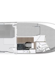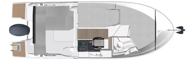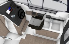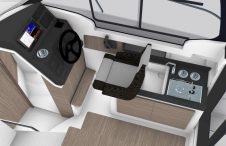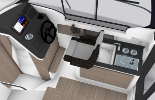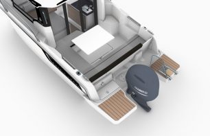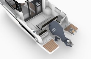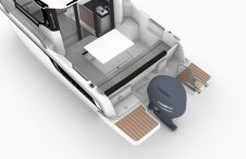 Идеально подходит для семейных пикников и рыбалки. Отдельный гальюн, панорамно остекленный салон, кокпит с удобным доступом, широкие платформы для купания. Отличная мореходность и управляемость. Лучший в классе габаритных катеров.