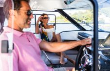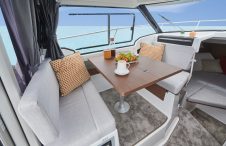 В салон ведет стеклянная трехсекционная дверь. Салон и кабина оборудованы всем необходимым – кухонной зоной, холодильником, полноценным санузлом с душем! В обеденной зоне складной стол и перекидная спинка дивана. В катере множество мест для хранения и 4 спальных места.