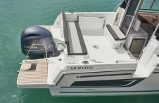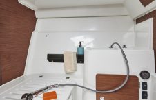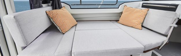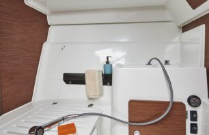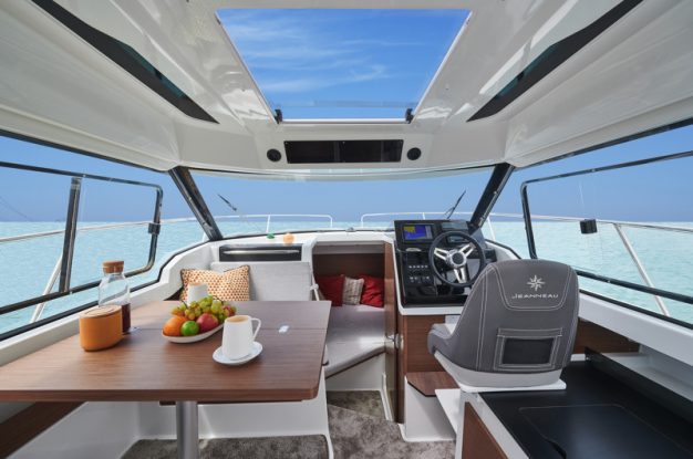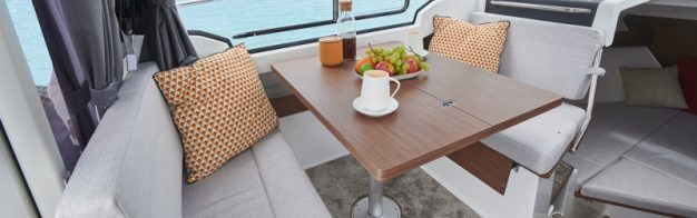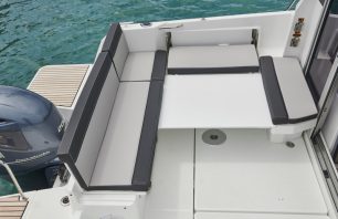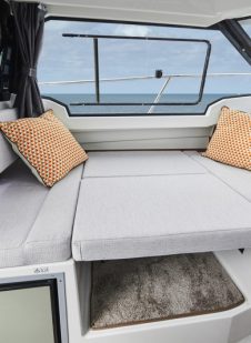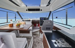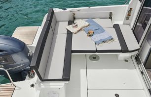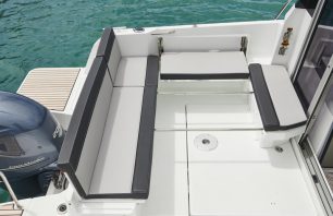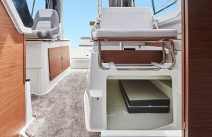 Кокпит просторный и модульный. Откидная скамья по левому борту позволяет использовать пространство под разные задачи – обеденная зона с U-Образным салоном, лежак для загара или большая площадка для рыбалки!
